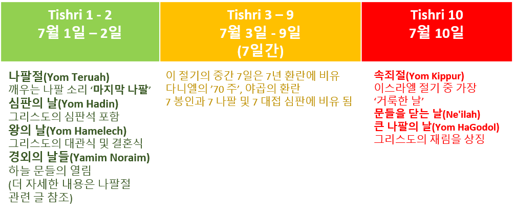 유대인들은 ‘생명책(성경에 총 8번 등장-빌립보서에 1번, 요한계시록에 7번)’에 이름이 기록되지 못한 사람들은 나팔절에서 속죄절까지 이어지는 10일 기간이 죄악에서 돌이키고 하나님께로 회개해 구원을 얻는 기회라고 믿었습니다(하나님의 완전수 10에 대한 자세한 내용은 여길 누르시기 바랍니다). 이 기간은 교회가 세상에서 옮겨지고 난 후 예수님이 재림하시기까지의 7년 환란에 비유할 수 있다고 생각합니다. 이 기간을 통해 하나님께로 돌아오는 환란 성도들이 있기 때문입니다. 따라서 어떤 학자들은 나팔절에서 속죄절까지의 기간을 7년 환란에 비유하기도 하는데 그 이유는 다음과 같습니다(하나님의 완전수 7에 대한 자세한 내용은 여길 누르시기 바랍니다).