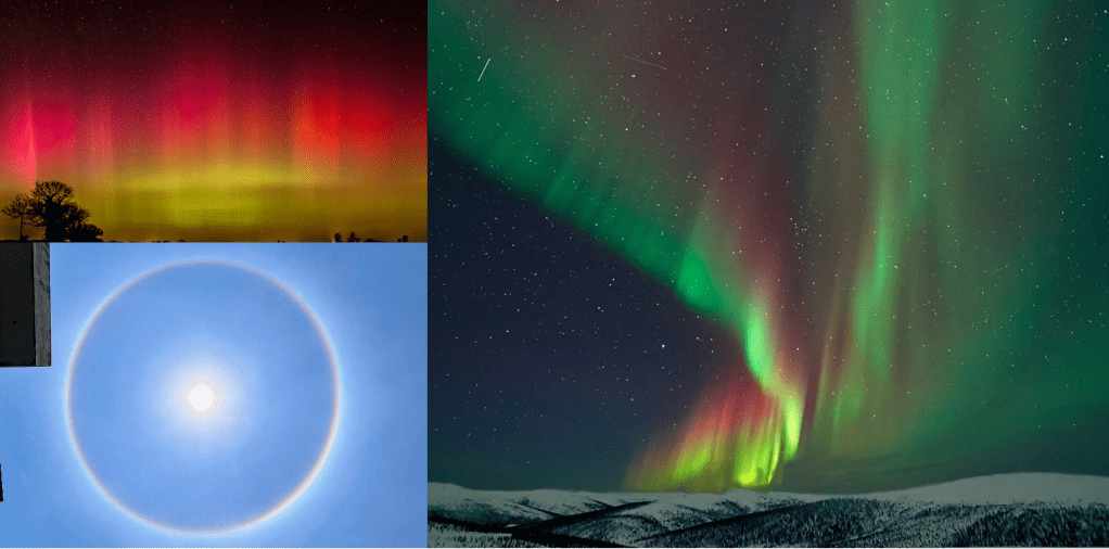 요즘 북극에서나 볼 수 있었던 오로라가 전 세계 방방곡곡에 나타나고 있습니다. 그중 본절에 나오는 색깔과 가장 가깝게 나타났을 것 같은 오로라와 해무리 무지개를 첨부합니다.